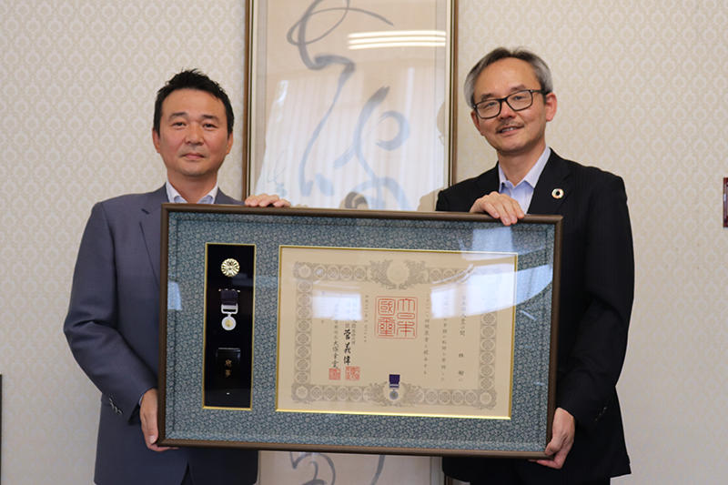 宇都宮大学3C基金に多大なご寄附をいただきました株式会社栃木ブレックス 関 雅樹会長がこのたび平成31年4月27日付で日本国政府より紺綬褒章が授与され、7月23日(火)に本学学長室にて、石田朋靖学長から紺綬褒章を伝達されました。