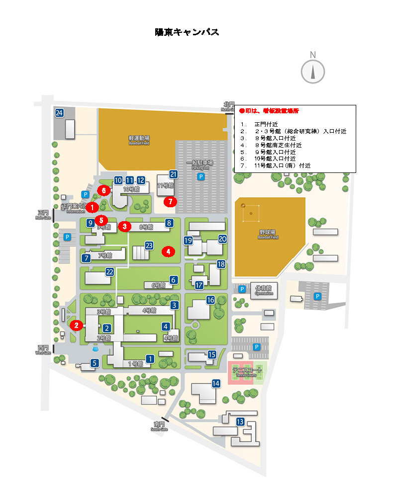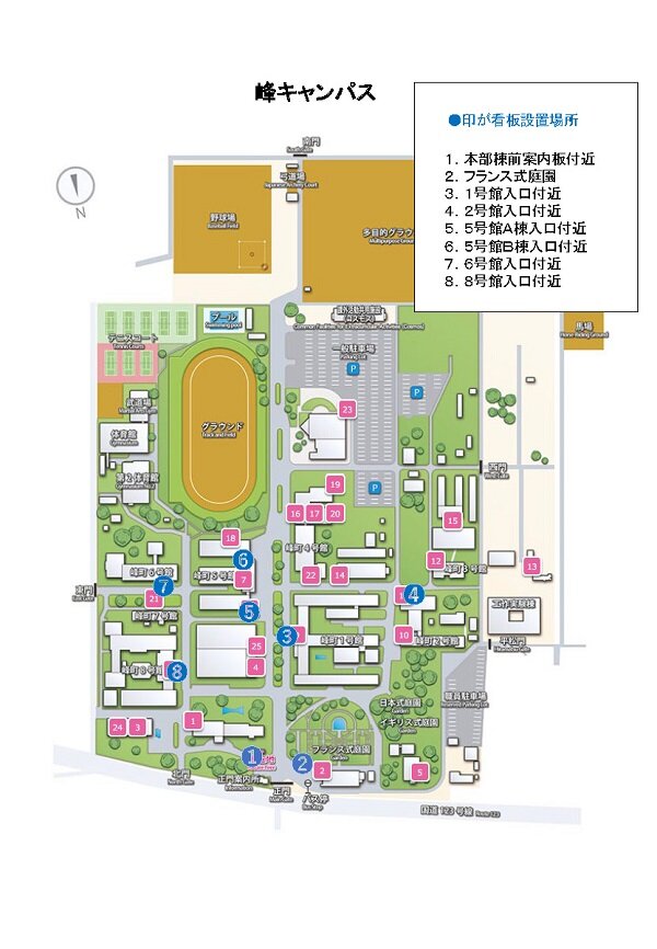 お祝いの気持ちを込めた看板を学内各箇所に設置しています。(設置個所は添付のとおり)ご友人との記念撮影の際にご活用ください。