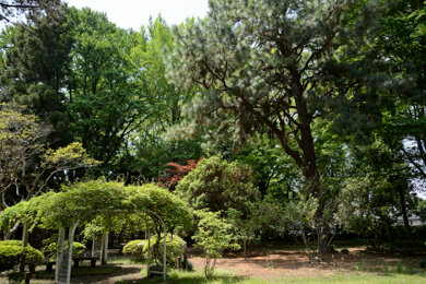 日本式庭園はイギリス式庭園の東側に位置し、築山(ロックガーデン)と池で構成された比較的小ぶりの庭園です。戦争中は泰安殿が建っていましたが、戦後撤去し、古賀志山と秩父から運んだ石を使ったロックガーデンと池を造成しました。池には睡蓮が咲き、カモやカワセミなどの野鳥もしばしば目撃されます。