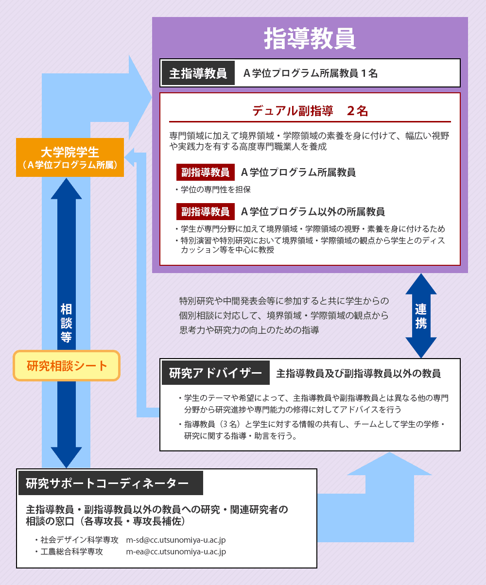 指導教員が、「研究計画書」に則り、学生の研究及び論文指導と授業科目の履修指導に当たるほか、学生からの研究相談として、研究サポートコーディネーター及び研究アドバイザーを配置