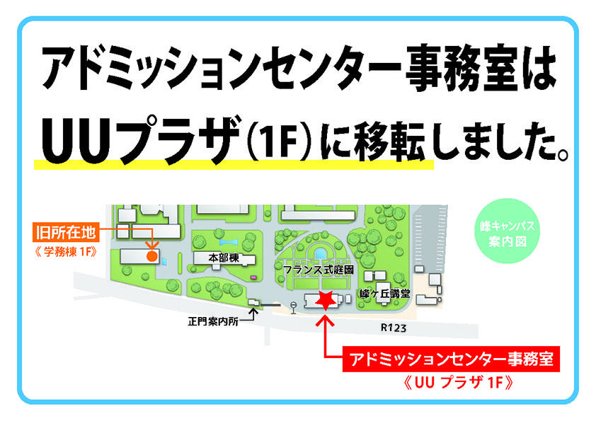 宇都宮大学アドミッションセンター事務室は、峰キャンパス学務棟(ミニストップのある建物)から、峰キャンパスUUプラザ(正門西・フランス式庭園前)に移転しましたのでお知らせいたします。