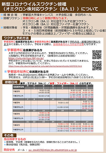 [在学生・教職員の皆さまへ]宇都宮大学を会場とする新型コロナウイルスワクチン接種(オミクロン株対応(BA.1))について