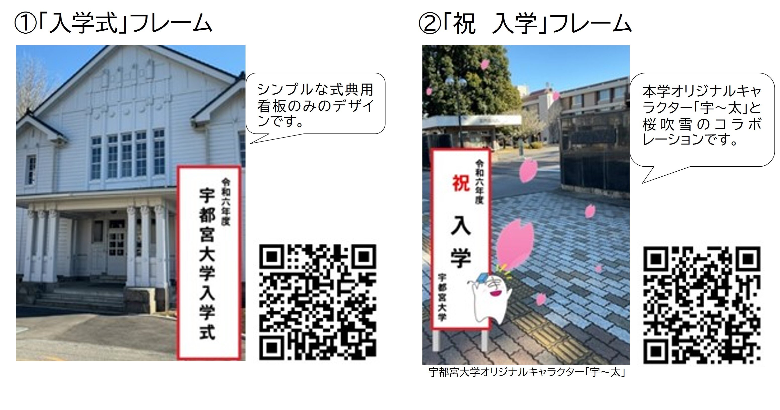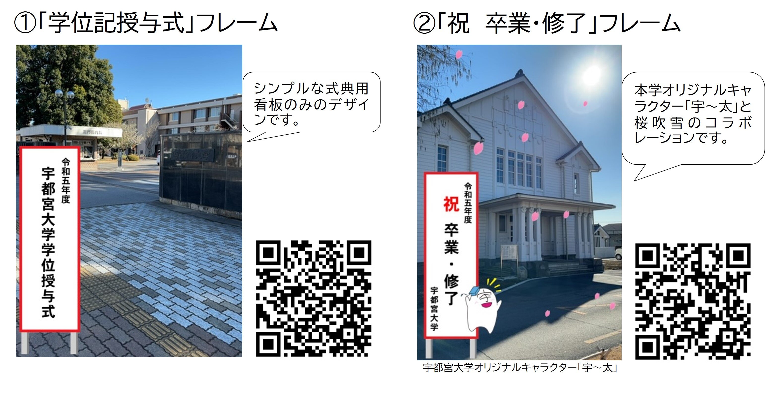 学位記授与式及び入学式用に各2種類のフレームをご用意いたしましたので、是非ご利用ください。