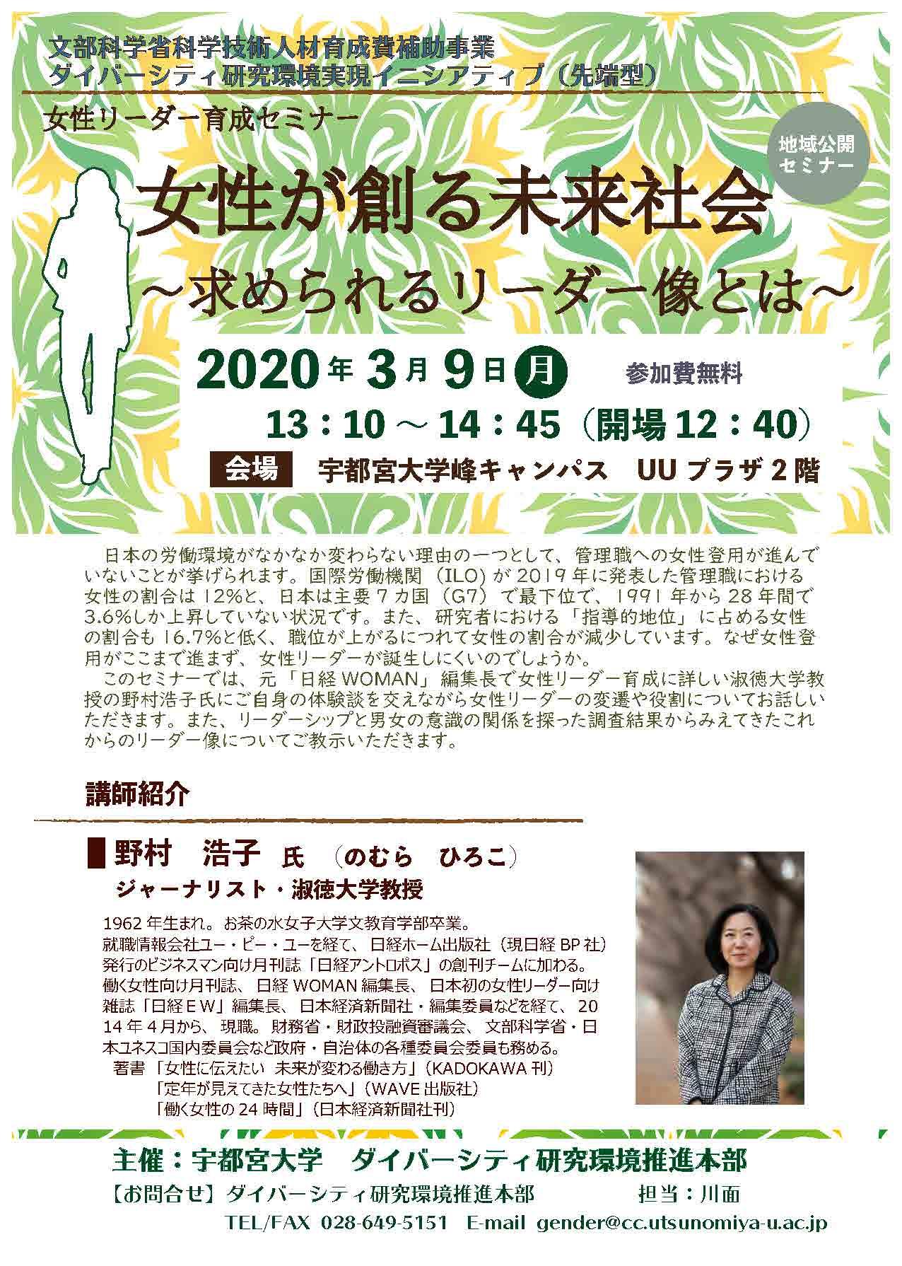 宇都宮大学は、平成 30 年度文部科学省科学技術人材育成費補助事業「ダイバーシティ研究環境実現イニシアティブ(先端型)」に採択されたことを受け、女性リーダー育成オフィスを新設し、女性研究者の研究力向上と上位職登用をサポートしています。この女性リーダー育成セミナーは、リーダー育成事業に生かしていくことを目的とし開催いたします。