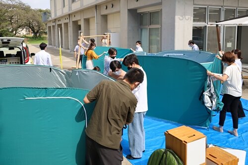 学生および教職員が災害時等に避難所で使用するテントやパーティションの設置や片付けを体験。