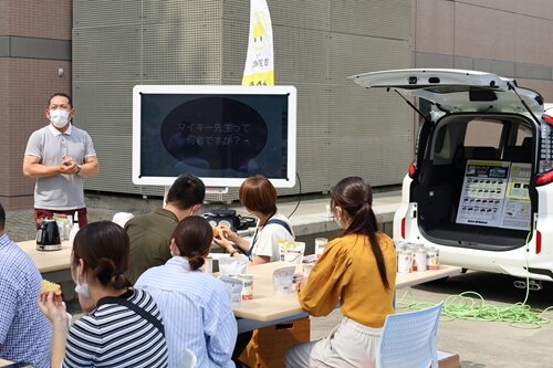 防災に関するクイズに答えたり、災害支援経験者による実際の現場のお話を聞きながら、給電可能な乗用車を使用して調理した防災食を試食しました。