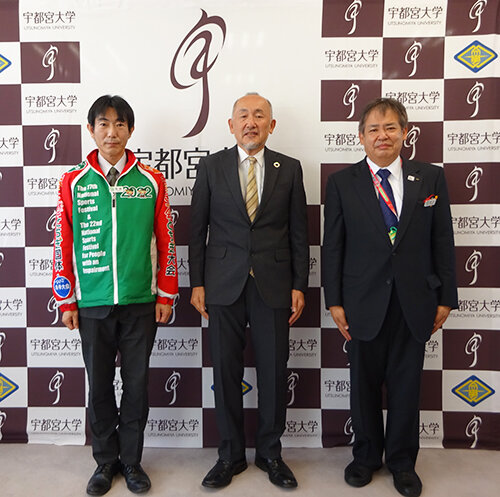 11月16日(水)に栃木県から参事(兼全国障害者スポーツ大会課長)の渡辺 直人氏及び全国障害者スポーツ大会課大会運営担当係長の齋藤 佳英氏が「いちご一会とちぎ大会(第22回全国障害者スポーツ大会)」に本学の学生が選手団サポーターとして協力したことに対するお礼のご挨拶にお見えになりました。