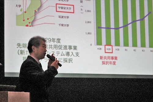 今回のシンポジウムでは、本学機器分析センターの松本太輝准教授が今回の連携の趣旨や展望を、栃木県産業技術センターの伊藤繁則副所長がセンターの概要の説明等を講演しました。