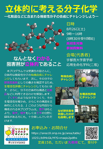 [高校生対象]ひらめき☆ときめきサイエンス「立体的に考える分子化学―化粧品などに含まれる機能性分子の合成にチャレンジしよう―」を開催します(8/26)