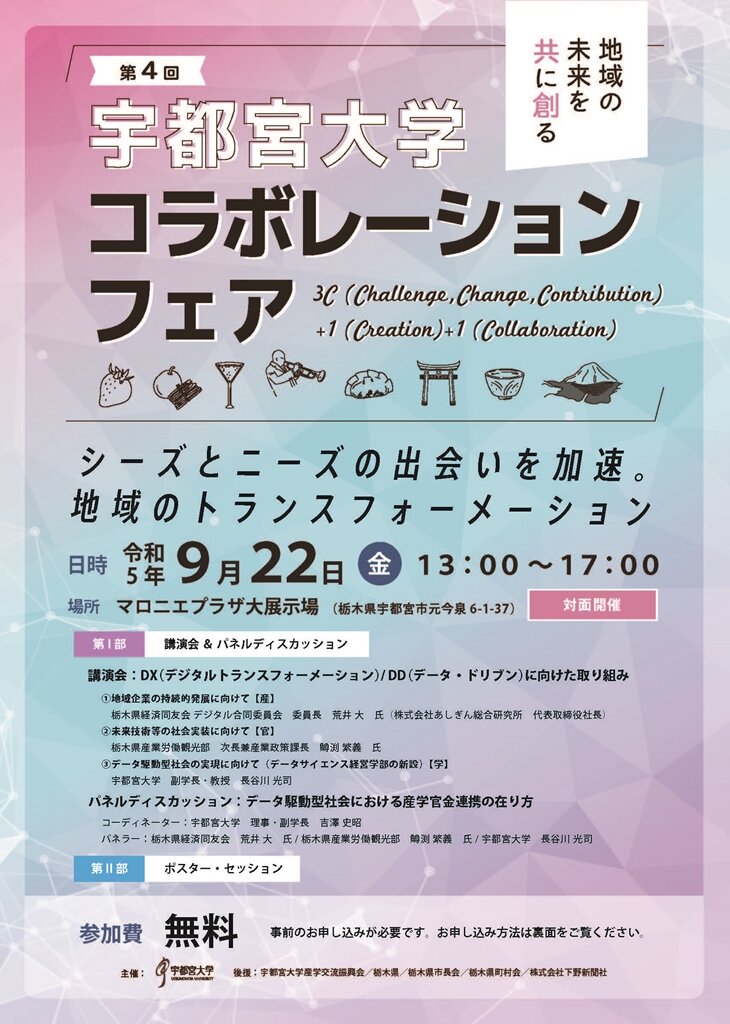 宇都宮大学は「地域活性化のエンジン」という使命のもと、スケールアップした産学官金連携の場として、9月22日に栃木県内で最大級の講演会&展示会である「第4回コラボレーション・フェア」をマロニエプラザ大展示場にて開催します。