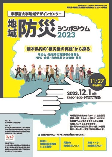 12月1日(金)にライトキューブ宇都宮(宇都宮駅東口交流拠点施設)にて、地域デザインセンター地域防災シンポジウム2023「防災士・地域防災実践者の組織化とリカレント教育~栃木県内の"被災後の実践"から探る~」を開催します。