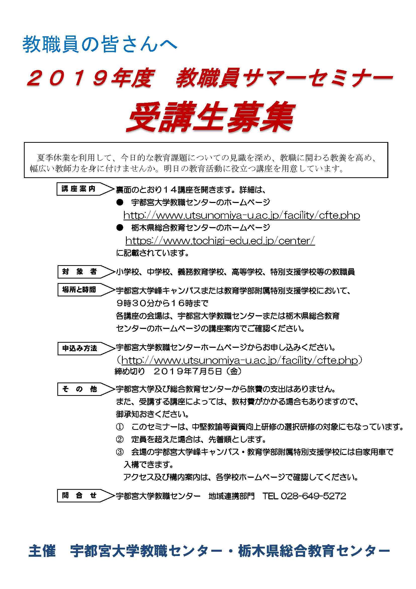 教職員の皆様。夏季休業を利用して、今日的な教育課題についての見識を深め、教職に関わる教養を高め、幅広い教師力を身に付けませんか。明日の教育活動に役立つ講座を用意しています。