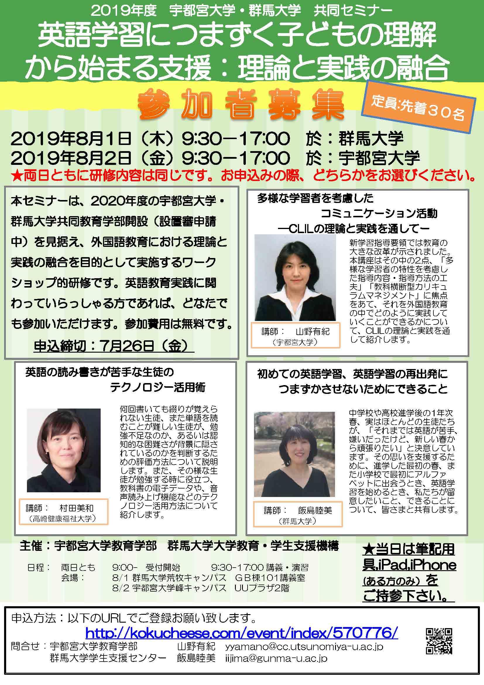 [イベント]2019年度 宇都宮大学・群馬大学 共同セミナー「英語学習につまずく子どもの理解から始まる支援:理論と実践の融合」を開催します(8/1(木)・2(金))