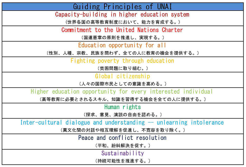 UNAIは、人権尊重や教育振興、持続可能な社会や紛争解決等の国連の掲げる目標等の実現を促進するために、世界中の高等教育機関が参加する国連の活動の一つで、すでに日本で約70大学、世界で1,000大学ほどが登録しています。