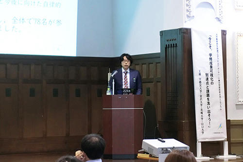 このシンポジウムは,平成26年度に採択され,令和元年度に最終年度を迎える「大学教育再生加速プログラム(テーマI・II複合型)」で,本学,金沢大学,長崎大学,山口大学の4大学が取り組んできた学修成果可視化の到達点について広く公表すると共に,学修成果可視化を行う際の課題とその解決方法等について参会者とともに考えるもので,上記4大学の取組報告,ワークショップの2部構成で行われました。なお,取組報告の冒頭では,テーマI・II複合型幹事校の京都光華女子大学短期大学部 学生サポートセンターAP担当 溝口 侑氏より幹事校としての取組についての報告がありました。