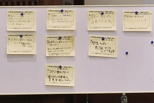 【教員・職員・学生で編成されたグループ議論の様子】 【グループごとにまとめた学修成果の可視化についての疑問】