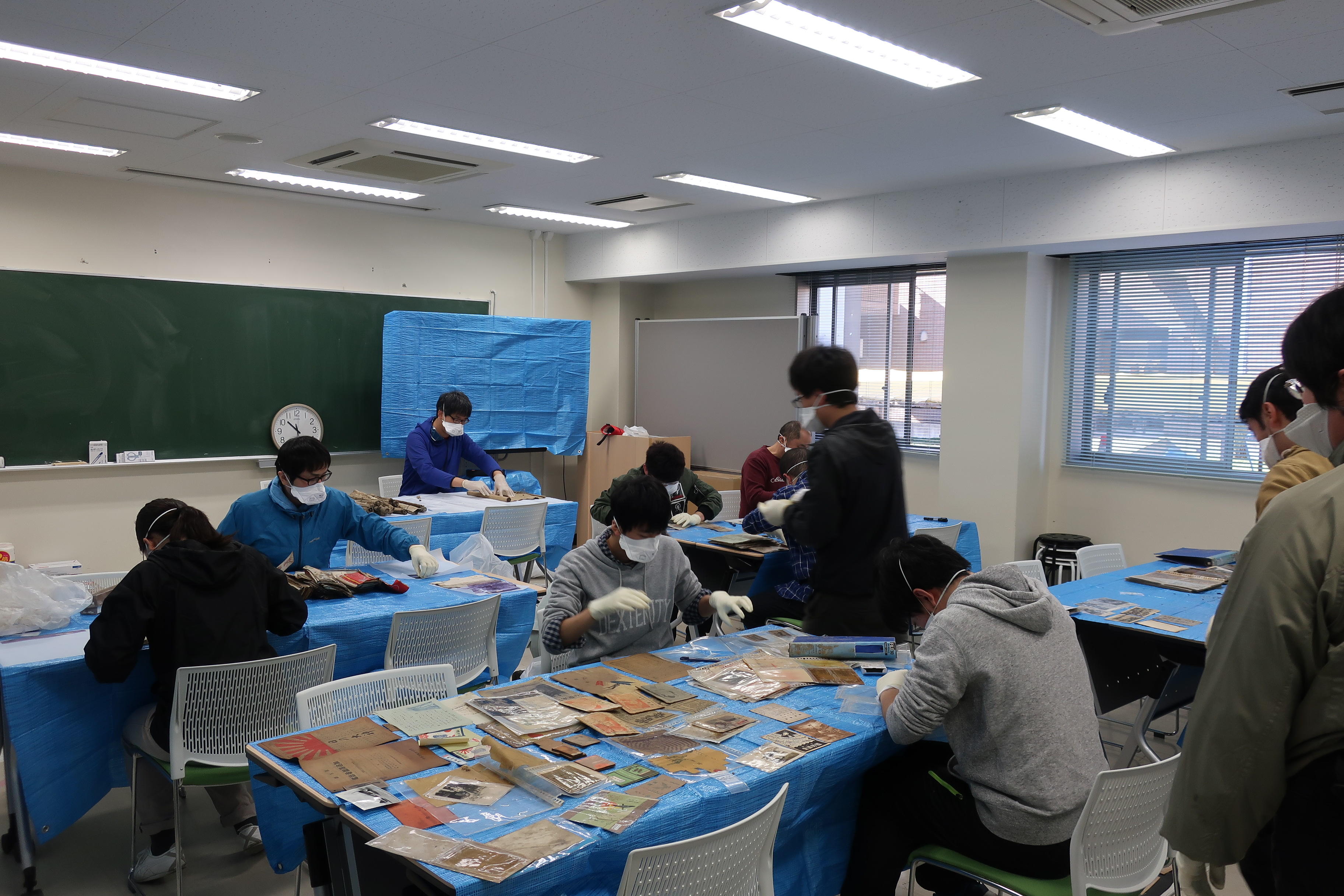 11月16日、台風で決壊した秋山川沿いにある佐野市の民家で、水や泥を被った戦前の写真・軍事郵便・教材などの戦争関係資料(段ボール20箱分)を運び出しました。その後、本学に運び、水損資料の乾燥・修復作業が進められています。17日の本学での修復作業に参加した学生は、作業後には充実した表情で、とても貴重な経験ができたと話していました。