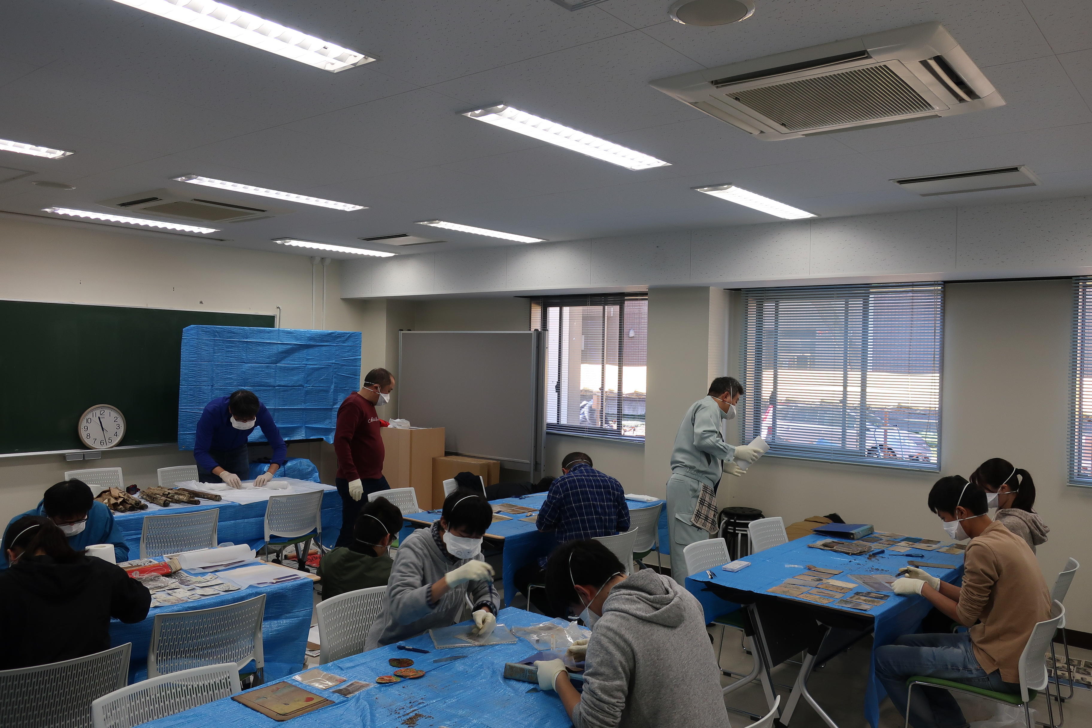 11月17日(日)、前日に佐野から運び出した水損資料の乾燥・修復作業をしている様子。被災資料レスキューの専門家に学びながら、宇大の学生も水損資料の処置に取り組んでいます。