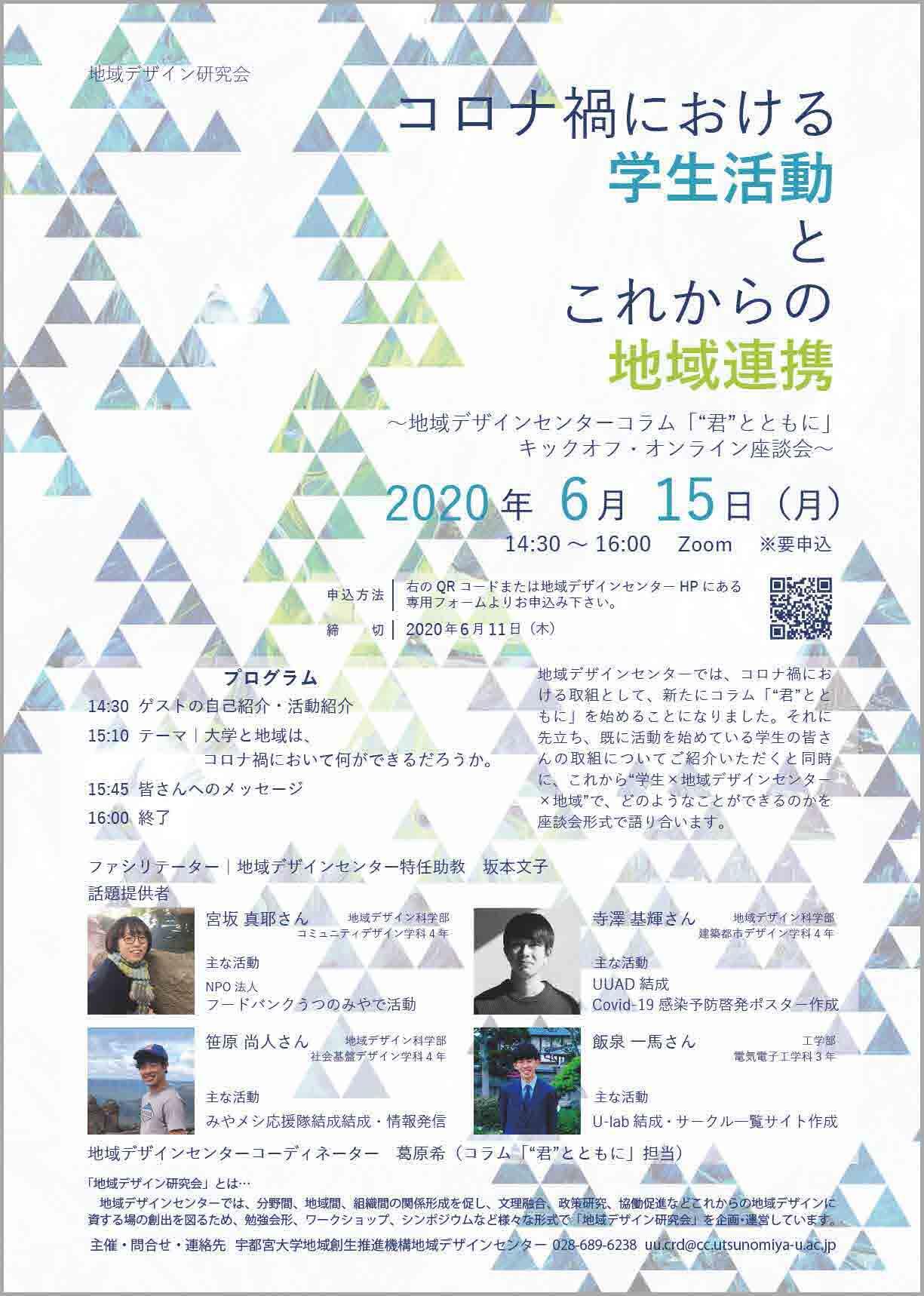 地域デザインセンターでは、コロナ禍における取組として、新たにコラム「"君 "とともに」を始めることになりました。それに先立ち、既に活動を始めている学生の皆さんの取組についてご紹介いただくと同時に、これから"学生×地域デザインセンタ ー×地域"で、どのようなことができるのかを 座談会形式で語り合います。