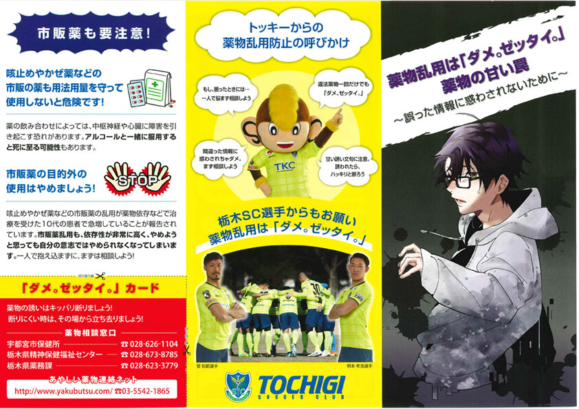 本学では、宇都宮市保健所と協力して薬物乱用防止啓発のボランティア活動を行っています。栃木SCの試合会場や大学祭(峰が丘祭)、街頭キャンペーン(宇都宮市内)など、啓発活動を実施しております(今年度は中止)。興味がある方は、活動を再開した際には、是非、参加してください。