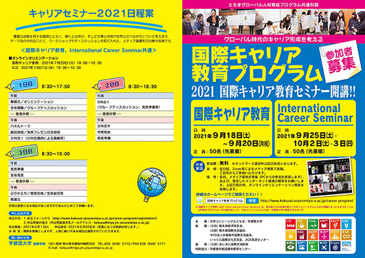 宇都宮大学では、国際キャリア教育プログラム「国際キャリア教育」「International Career Seminar」を開催しています。例年、宇大生のみならず、全国からの大学生、社会人、高校生に参加いただいてきました。今年度はCovid-19禍における取り組みとして、Zoomによるオンライン集中講義形式で開催いたします。国際キャリア経験豊富な講師たちとともに、3日間じっくりと国際協力や多文化共生等について一緒に学び、国際社会や地域社会へのキャリア形成の可能性を探ってみませんか?受講を完了した方には、独自の修了証もお渡しします。皆さんの参加を心よりお待ちしています。