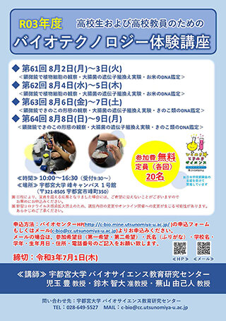 令和3年度 高校生および高校教員のための「バイオテクノロジー体験講座」を開催します