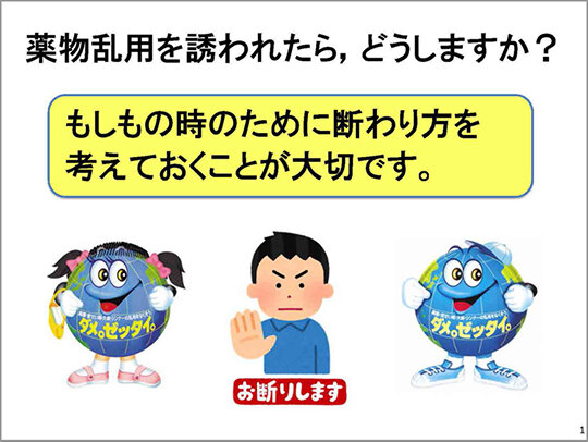 「一度だけなら」と軽い気持ちで使い始めて依存症となり、取り返しがつかない人生とならないためにも、薬物乱用は一回でも「ダメ。ゼッタイ。」なのです。勧められても、キッパリ「イヤだ」と断りましょう。