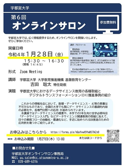 宇都宮大学第6回オンラインサロン「宇都宮大学におけるデータサイエンス教育の各種取組とデジタルトランスフォーメーション(DX)推進事例の紹介」を開催します(1/28)