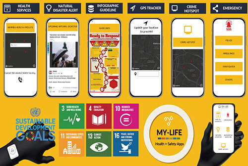 学生達はグループごとにオンラインで意見交換をしながら、「災害時に役立つものづくり」の一環として、「健康+安全アプリ:MY-LIFE」のアプリ、動画、ポスターを制作しMTEへ出展しました。