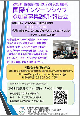 「2021年度春期報告、2022年度夏期募集 国際インターンシップ 参加者募集説明・報告会」を下記の日程で開催します。海外インターンシップに興味がある方、ぜひご参加ください!