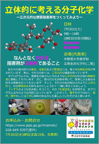 【高校生対象】ひらめき☆ときめきサイエンス「立体的に考える分子化学―三次元的な酵素阻害剤をつくってみよう―」を開催します(7/30)
