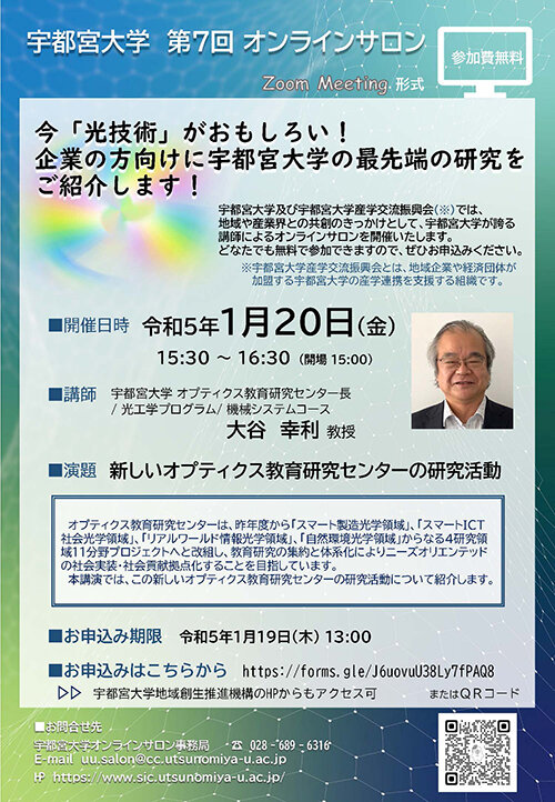 第7回目となる今回の講演テーマは「新しいオプティクス教育研究センターの研究活動」。オプティクス(光学)とは光に関する学問であり、産業界との連携が盛んな宇都宮大学オプティクス教育研究センターの研究活動についてご紹介します。