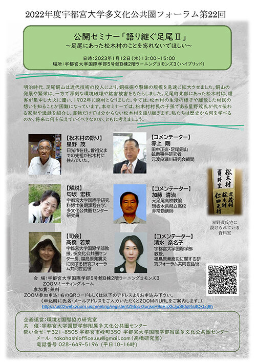 明治時代、足尾銅山は近代技術の投入により、銅採掘や製錬の規模を急速に拡大しました。銅山の発展や繁栄の一方、深刻な環境破壊や鉱害被害をもたらしました。足尾町北部にあった松木村は、煙害が集中し大火に遭い、1902年に廃村となりました。今では、松木村の生活の様子や離散した村民の想いを知ることが困難になっています。本セミナーでは、松木村村民の子孫である星野茂氏が代々伝わる家財や逸話を紹介し、書物だけでは分からない松木村を語り継ぎます。私たちは歴史から何を学べるのか、将来に何を伝えていくべきなのか、ともに考えましょう。