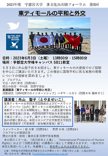 今回の多文化公共圏フォーラムでは、在東ティモール日本国大使館職員として活躍された外山聖子氏をお招きして、大使館でのご経験を中心に「東ティモールの平和と外交」についてご講演いただきます。この機会に国際平和に係る実務の現場についての理解を深めてみませんか。