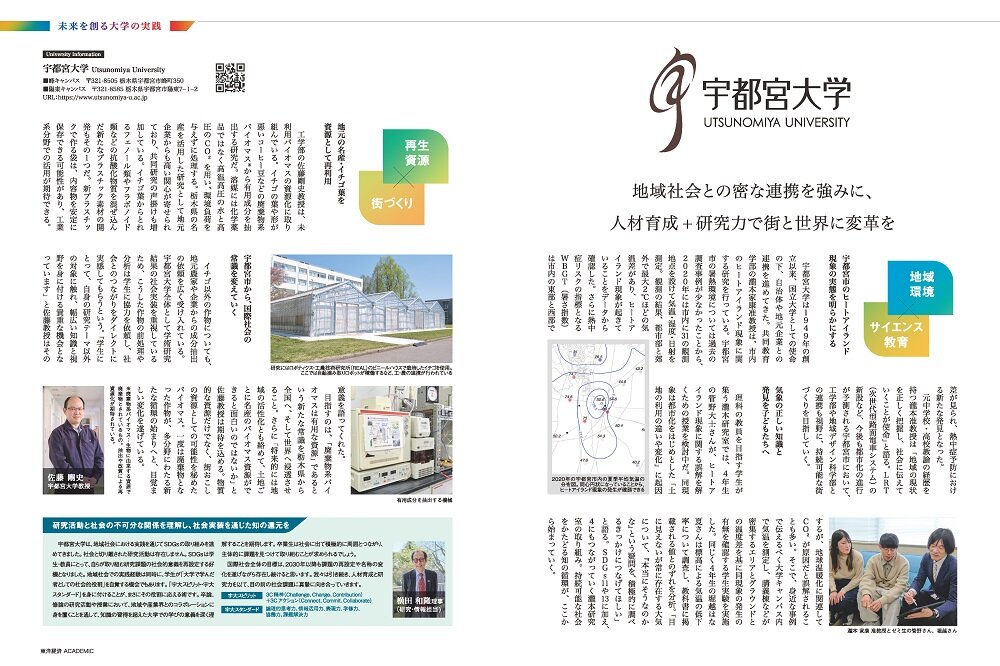 広告ページ「未来を創る大学の実践」の中では、「宇都宮市のヒートアイランド現象の実態の解明」そして「地元の名産・イチゴ葉を資源として再利用する取組」の2つの研究を紹介しています。