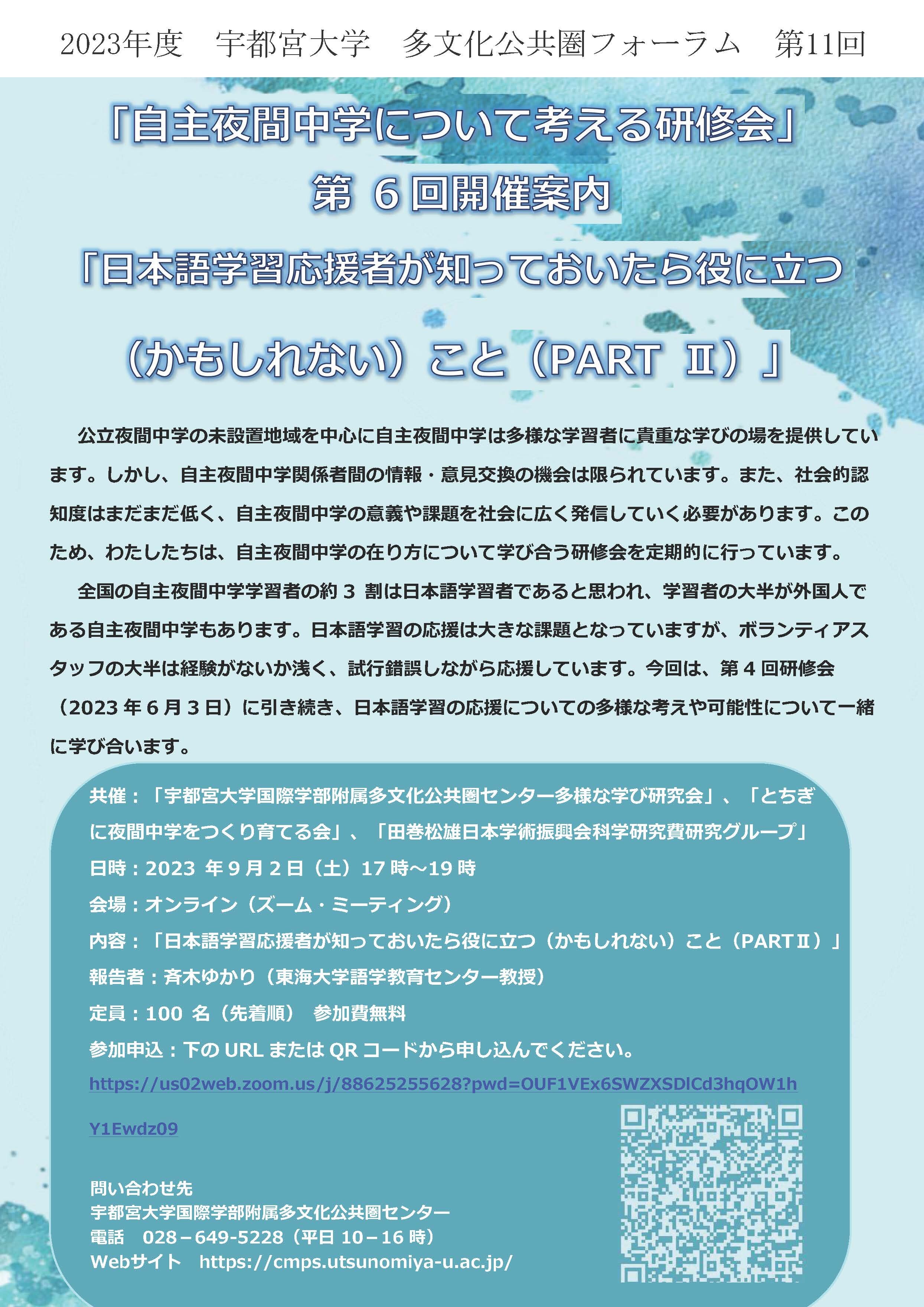 [イベント]多文化公共圏フォーラム第11回 自主夜間中学について考える研修会第6回「日本語学習応援者が知っておいたら役に立つ(かもしれない)こと(PARTⅡ)(9/2)