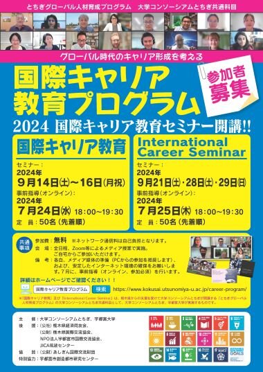宇都宮大学では、国際キャリア教育プログラム「国際キャリア教育」(日本語開催)・「International Career Seminar」(英語開催)をオンラインで開講しています。例年、宇大生のみならず、全国からの大学生、社会人、高校生に参加いただいてきました。国際キャリア経験豊富な講師たちとともに、3日間じっくりと国際協力や多文化共生等について一緒に学び、国際社会や地域社会へのCareer Pathを探ってみませんか?