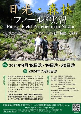 宇都宮大学では、令和6年度より公開森林実習を開講いたします。宇都宮大学農学部附属演習林は、日光国立公園内にある日光演習林と高原林業地にある船生演習林から構成されます。2つの演習林はそれぞれ、気候、地形、地質、植生などの条件や森林の生い立ちが異なっています。この環境を活かし、森林が生み出す生態系サービス「食・住・環境」について体験的に学ぶ実習を行います。