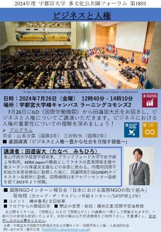 ILO(国際労働機関)から田邉宙大氏をお招きし、ビジネスと人権についてご講演いただきます。ビジネスにおける人権の重要性についての理解を深めましょう!