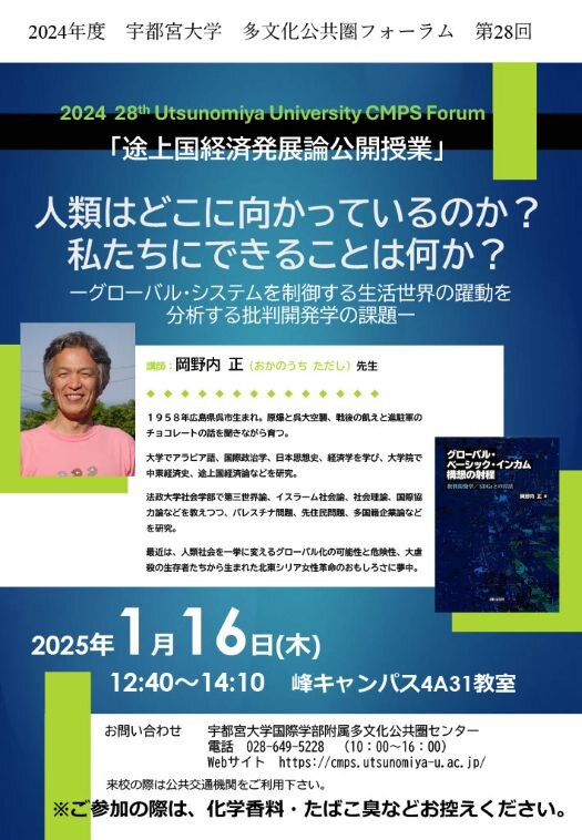 「「途上国経済発展論公開授業」人類はどこに向かっているのか?私たちにできることは何か?―グローバル・システムを制御する生活世界の躍動を分析する批判開発学の課題―」を開催します。法政大学教授である岡野内正先生をお招きし、ご講演いただきます。皆さまのご参加をお待ちしております。