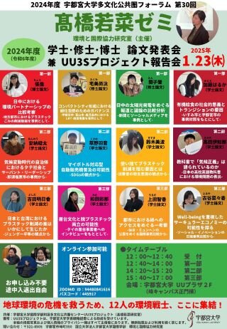 環境と国際協力研究室(髙橋若菜教授ゼミ)では、2024年度に卒業を予定している学生による「学士・修士・博士論文発表会」を2025年1月23日(木)に実施します。当研究室の活動は宇都宮大学国際学部附属多文化公共圏センターの「UU3Sプロジェクト」の一端を担っているため、今回の発表会は「宇都宮大学多文化公共圏フォーラム第30回 UU3Sプロジェクト報告会」を兼ねて開催します。発表する学生および論文タイトル、発表順は別紙チラシにてご確認ください。
