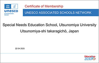 宇都宮大学共同教育学部附属特別支援学校は令和7年4月22日に、ユネスコ(国際連合教育科学文化機関)が主導するユネスコスクール加盟校として正式に認定されました。本学は、栃木県内では6校目の加盟校であり、特別支援学校としては県内初、さらに国立の特別支援学校としては全国で3校目となります。