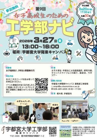 「工学ってどんなことを学ぶの?」「大学生活ってどんな感じ?」そんな疑問を持っている女子高校生のみなさんに向けて、宇都宮大学工学部では、女子大学生と直接話せるイベントを開催します!在学生や卒業生と直接話せるチャンス。進路選びのヒントを見つけてください。