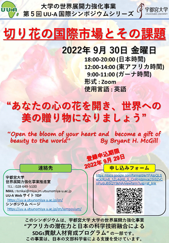 第1回目となる9月30日開催のシンポジウム「切り花の国際市場とその課題」では、高級なバラの切り花を世界に輸出しているアフリカ・ケニアのアグリビジネスを取り上げ、山根健治 農学部長、萩生田 愛 アフリカローズ取締役、ケニア・メル科学技術大学のEric MWORIA 博士の3名の方がお話します。