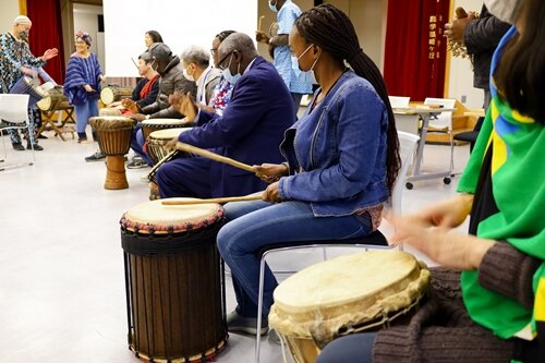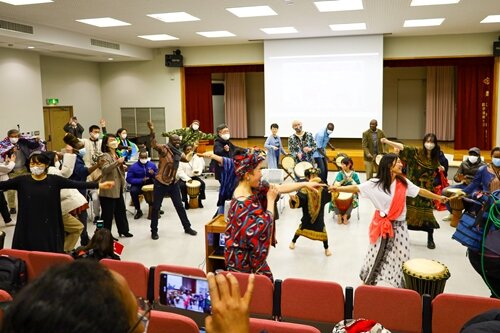 また、アフリカ音楽のパフォーマンスグループ「ジャンボいちかい」の皆さまをお招きし、陽気な打楽器の演奏や、歌と踊りを披露していただきました。後半は、参加者も演奏やダンスに加わり、大いに盛り上がりました。