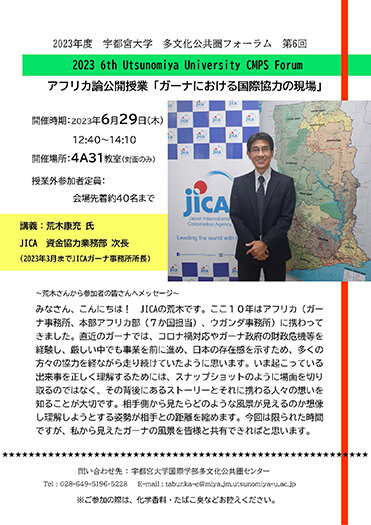 第6回の多文化公共圏フォーラムは、講師にJICA(国際協力機構)ガーナ事務所所長の荒木康充氏をお迎えして、アフリカ論公開授業「ガーナにおける国際協力の現場」を演題に開催します。