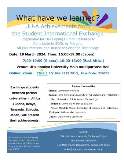 2023年度で4年目となる、大学の世界展開力強化事業~アフリカ諸国との大学間交流形成支援~「アフリカの潜在力と日本の科学技術融合によるSDGs貢献人材プログラム」による留学成果報告会を、昨年度に引き続き開催します。