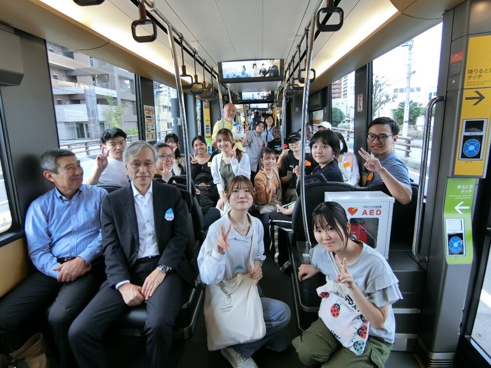留学生・国際交流センターは9月30日にLRT(次世代型路面電車)の貸切運行を行い、10月期の新規来日留学生歓迎会を開催しました。地元の資源を利用し、新規留学生と国際交流に関わる教職員や学生との親睦および相互理解を深めることを目的として実施したものです。LRTを利用した国際交流行事は本学では初開催で、13ヶ国・地域、33名の留学生の他、池田学長や教職員、留学生アドバイザー・チューターが参加しました。