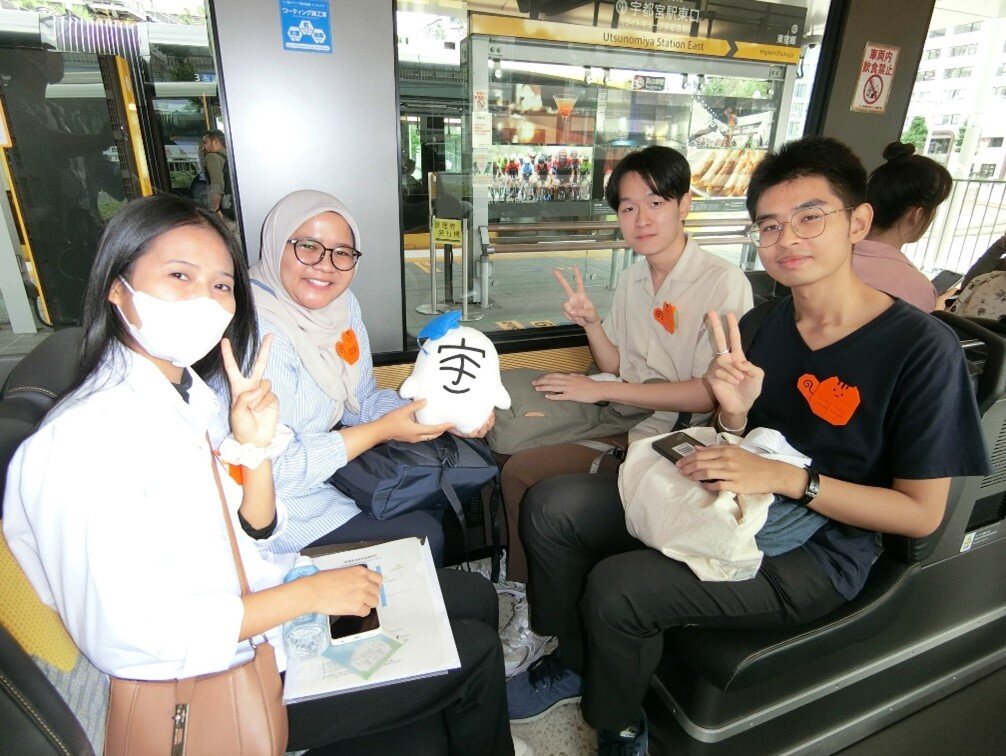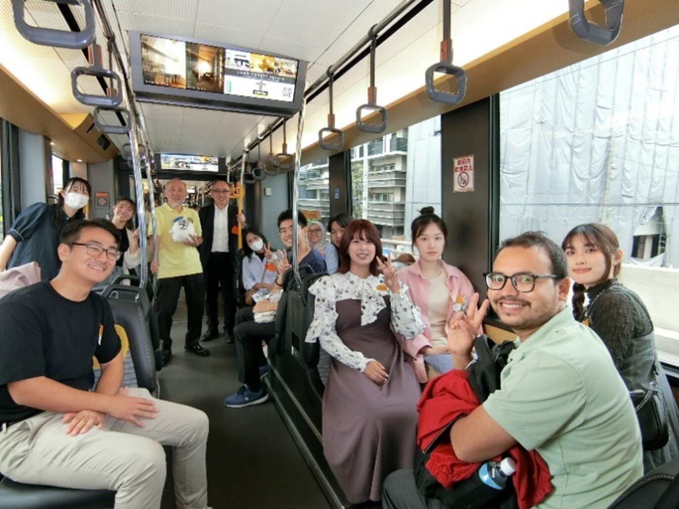 池田学長からは、留学生へのエールを込めた挨拶に続き、通学等の交通手段としても利用されているLRTへの理解が深まる話や、沿線地域についても紹介がありました。車内では、留学生と日本人学生から成る小グループに分かれて、自己紹介や様々なテーマによる会話等を通して交流活動が行われました。
