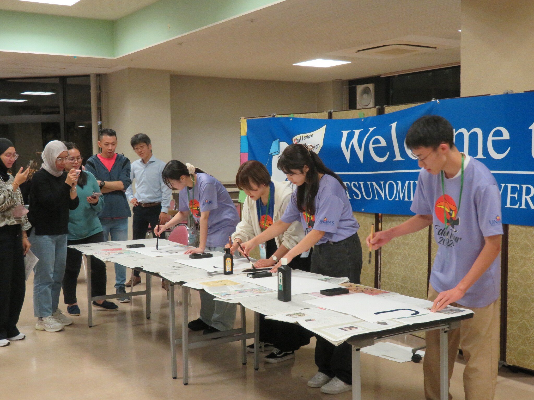 訪問団の歓迎イベントで宇大生が書道を披露